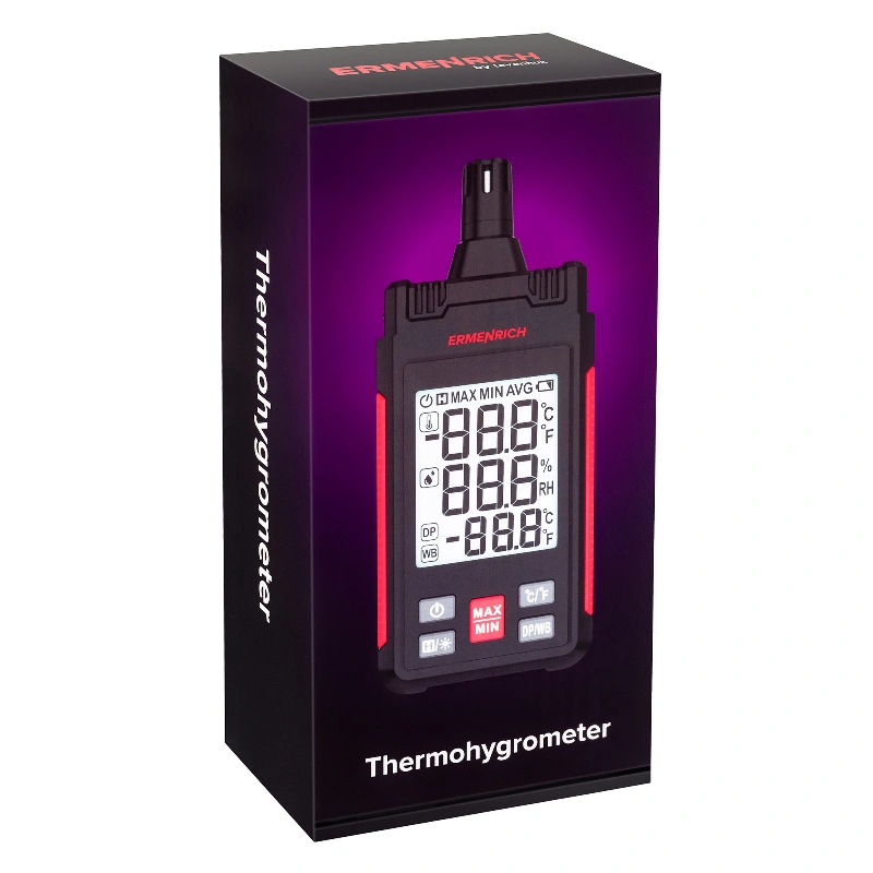 Термогигрометр Ermenrich Wett TU20 представляет собой простой измерительный прибор для точного мониторинга параметров микроклимата. Устройство совмещает в себе высокоточный гигрометр и термометр, предоставляя полную картину условий окружающей среды.